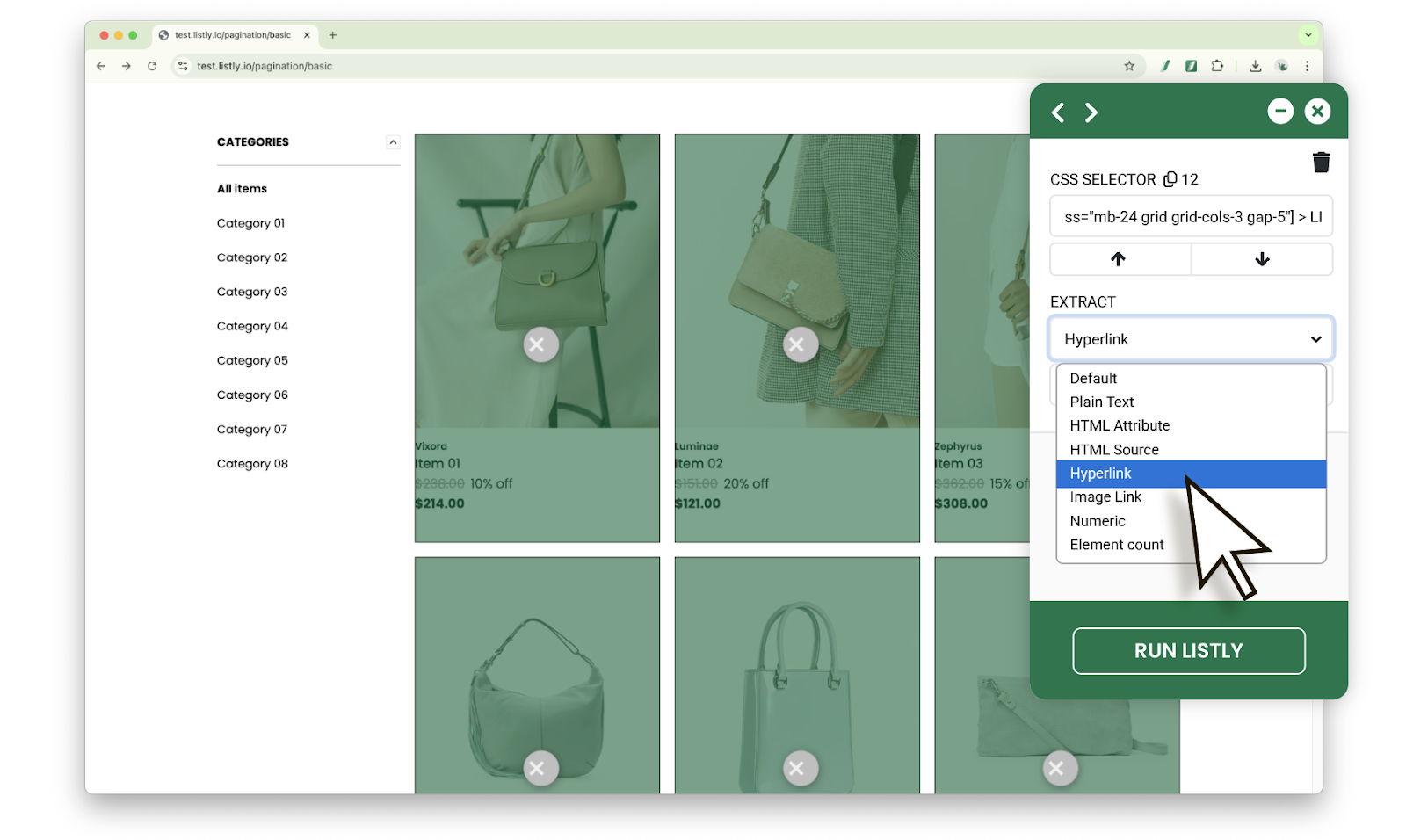 Después de seleccionar el área de extracción, seleccione 'Hyperlink' en las opciones de extracción para recopilar solo los enlaces de cada página de detalle.