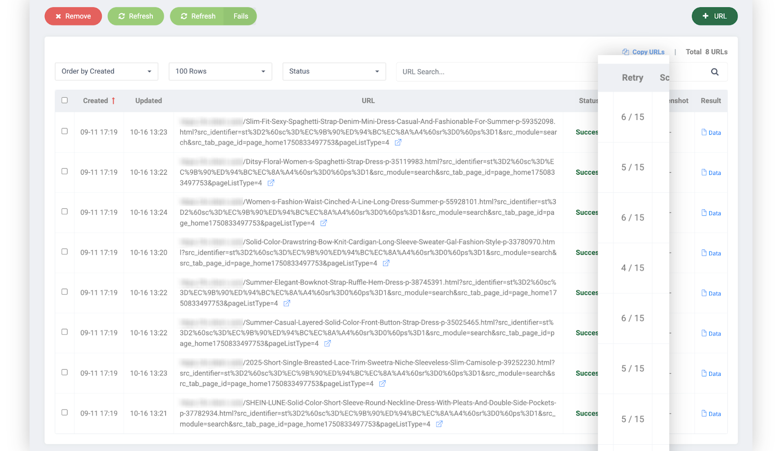 Una vez completada la extracción, puedes verificar los resultados del procesamiento de cada solicitud en la ventana de resultados del grupo. El número mostrado en la columna Reintentos de la tabla significa el registro del proceso de reintento automático de proxy.