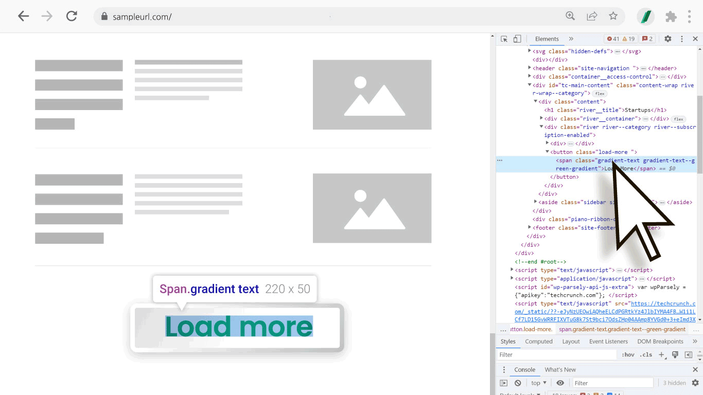 Solución-2 (Al usar herramientas de desarrollador): Al pasar el mouse sobre el código en las herramientas de desarrollador, el área del elemento correspondiente se resalta. En este caso, también selecciona la caja más grande que no exceda el área del botón y copia el valor del Selector CSS.