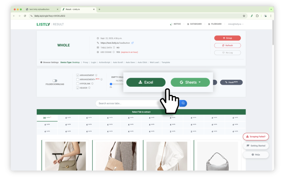 Al extraer [Completo], se moverá a la ventana de resultados aproximadamente 1~3 segundos después sin configuración adicional. Después de verificar los datos a extraer en la pestaña de vista previa inferior, haga clic en el botón [Excel] o [Google Sheets] para exportar los datos.