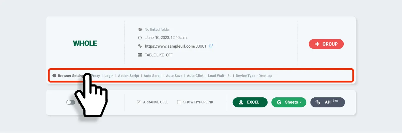 El ActionScript siempre debe aplicarse primero en la página de origen antes de la extracción grupal. La extracción grupal asume que todas las demás URLs tienen la misma estructura que la página representativa (página de origen) y recopila los datos en consecuencia. Si no aplicas el ActionScript a la página de origen, no habrá una referencia para que las URLs agregadas posteriormente realicen la misma acción, lo que puede causar errores de coincidencia de pestañas o pérdida de datos.