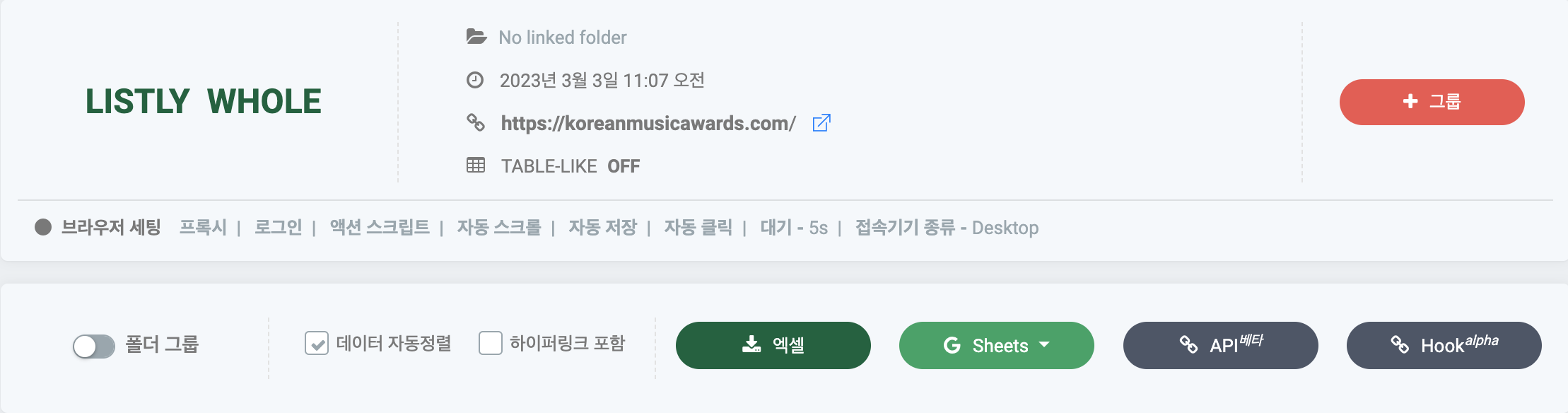 Encuentre la tarea de la que desea recibir notificaciones de resultados en el panel de datos de Listly y haga clic en el botón Datos a la derecha. Luego, como se muestra en la imagen a continuación, haga clic en el botón Hook a la derecha del menú superior para abrir la ventana de configuración de webhook.