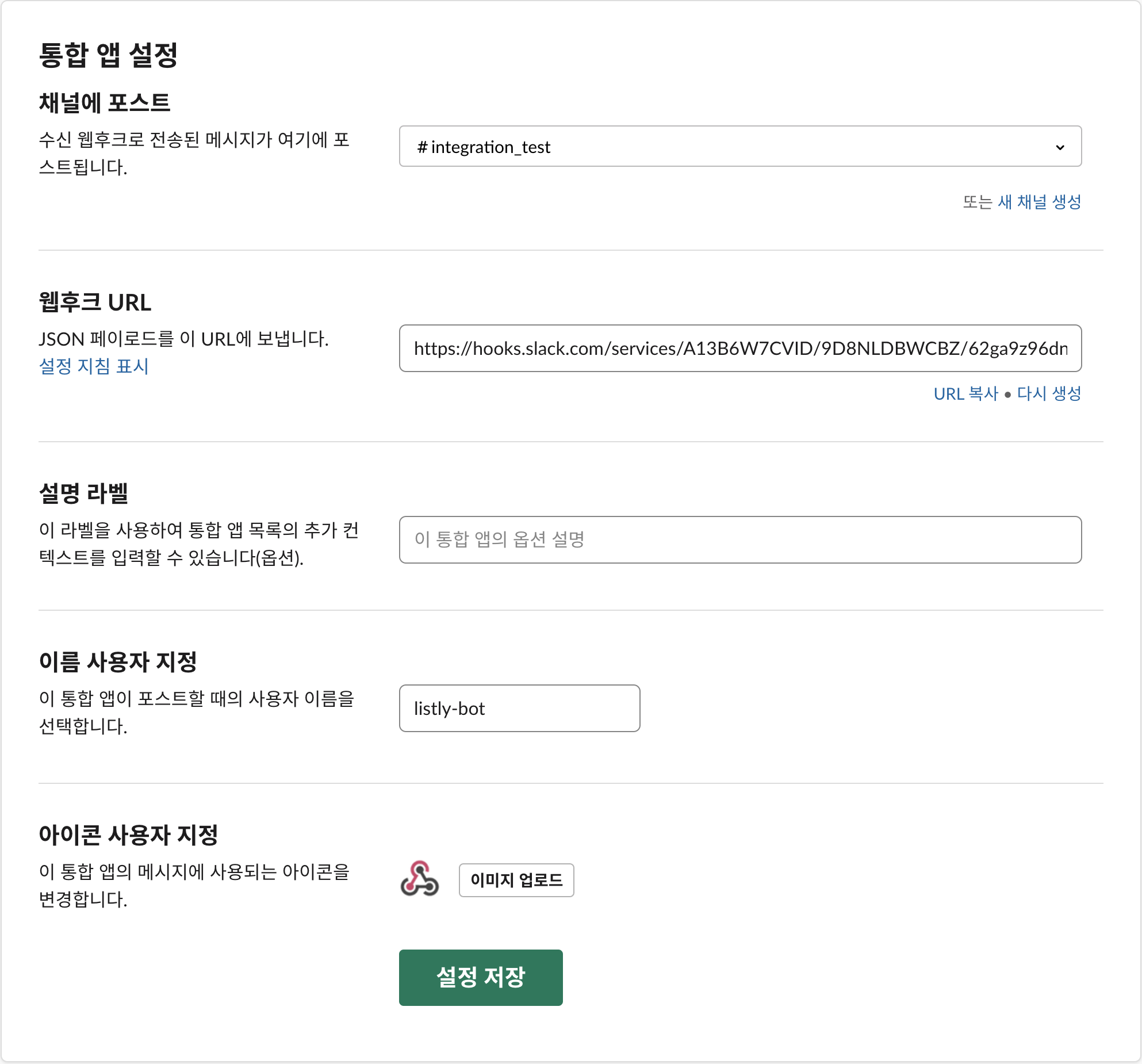 Después de agregar a Slack, puede seleccionar en qué canal recibir notificaciones. En este paso, también puede agregar un nuevo canal donde desea recibir notificaciones y establecer el nombre del bot que envía el mensaje de resultado de extracción. Después de copiar la URL del webhook necesaria para la integración del servicio de Listly, haga clic en guardar configuración.