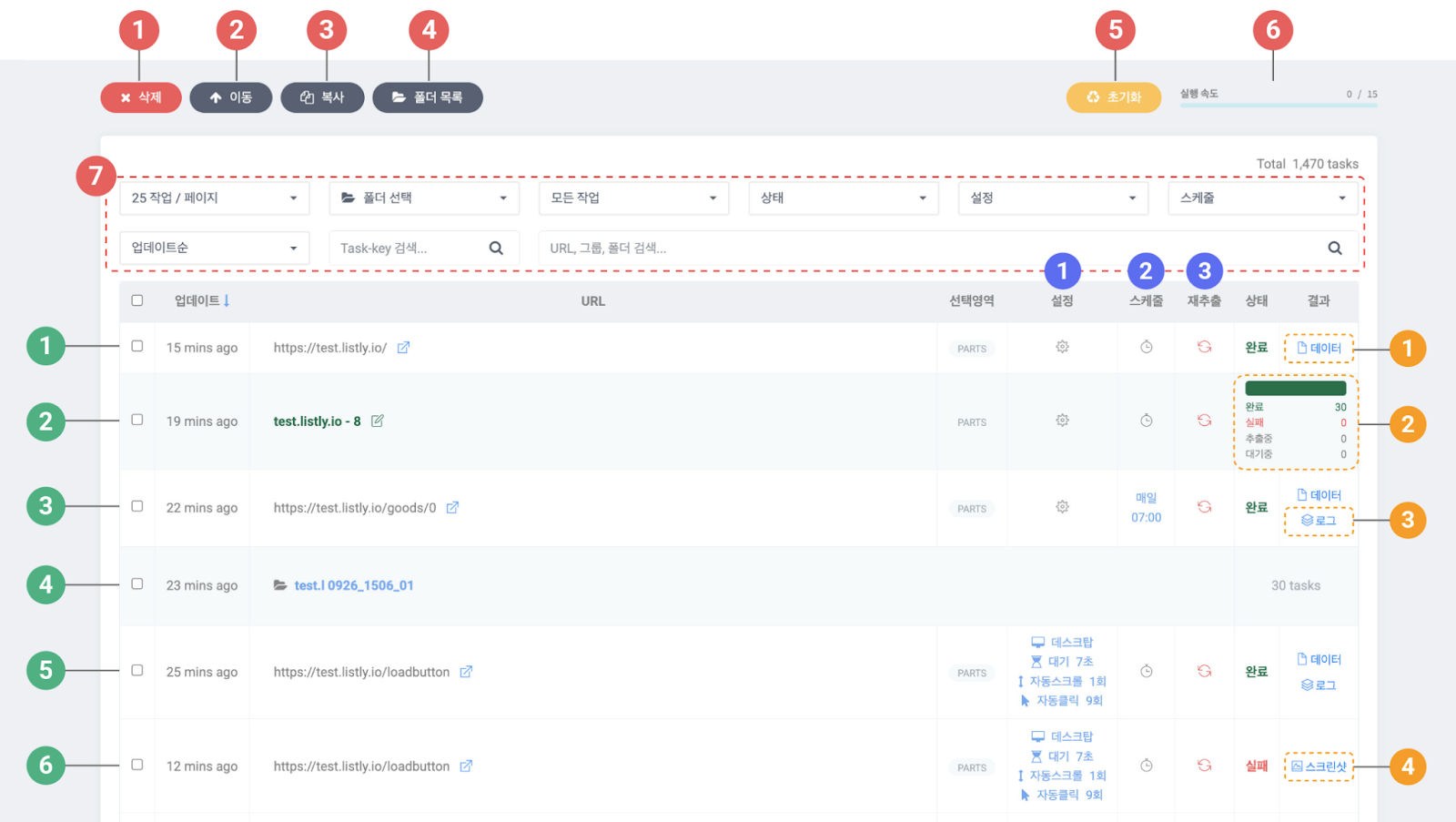 抽出したデータを一度に集めて見たり管理できるユーザースペースです。データボードで有料プラン機能である自動クリック、自動抽出、スケジューラーなど、データ抽出のための設定および再抽出、データログ、スクリーンショット機能にアクセスできます。