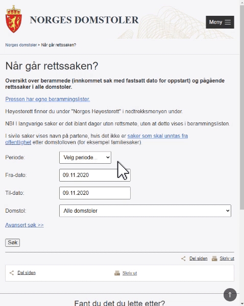 これは海外のユーザーからの実際のケースです。ノルウェーの裁判所サイトで過去2ヶ月間の検索結果を取得するには、オプション値(2 mnd. fremover)を選択し、検索ボタン(Søk)をクリックする必要がありました。検索結果が表示されたら、LISTLY Wholeで抽出し、LISTLYでこの作業を自動化して毎日データを収集しています。