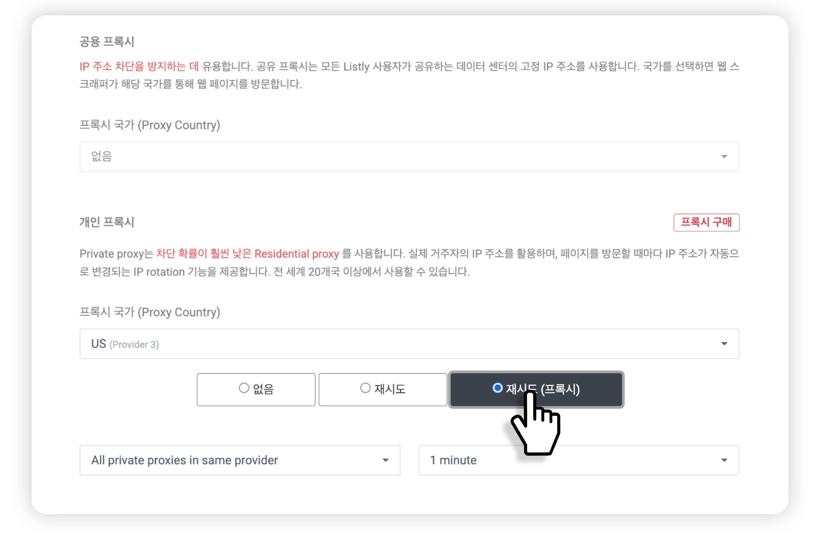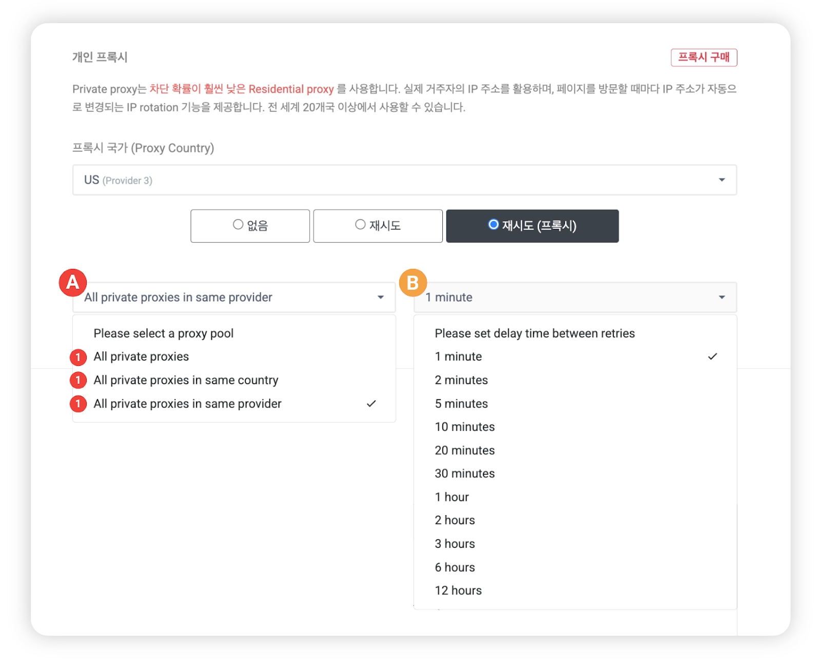 ➊ All Private proxies : 등록된 모든 개인 프록시 중 사용 가능한 IP를 순차적으로 재시도합니다.