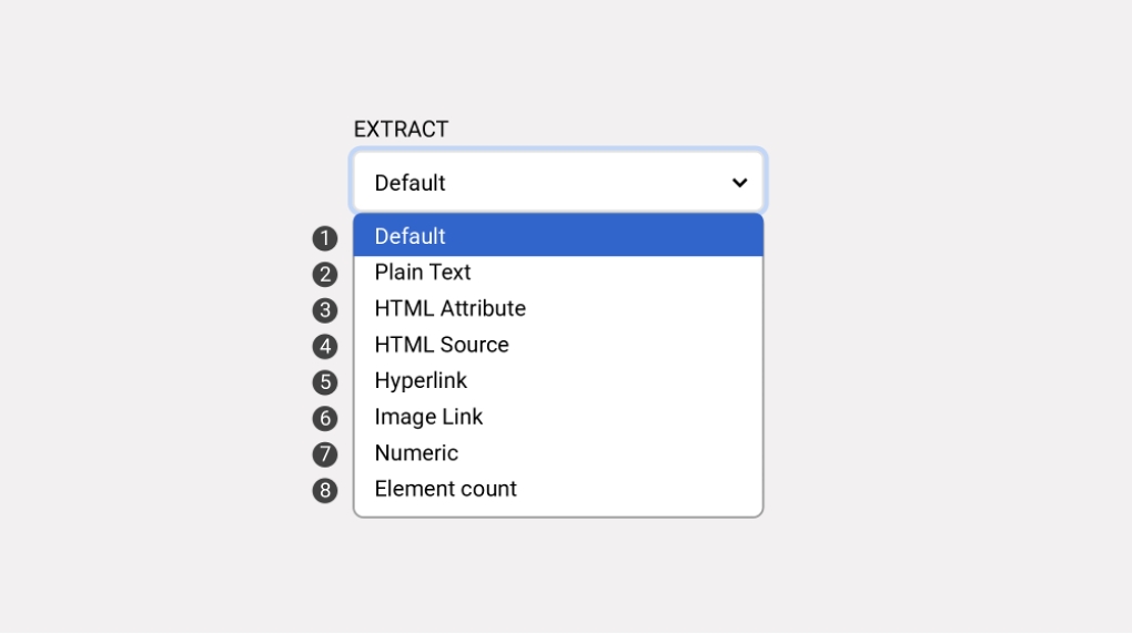 ➊ Default (기본값) : 텍스트, 이미지 URL, 하이퍼링크 등기본 제공 정보를 그대로 추출합니다. 대부분의 경우 기본값만으로 충분합니다.