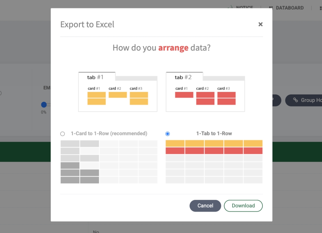데이터 정렬 옵션은 그룹 추출, 탭스 추출 등 여러 페이지를 한 번에 추출해 하나의 파일로 내보낼 때 설정할 수 있는 기능입니다. 데이터를 어떻게 활용할지에 따라, 개별 페이지의 결과를 카드 단위로 배열할 것인지, 탭 단위로 배열할 것인지를 선택할 수 있습니다.