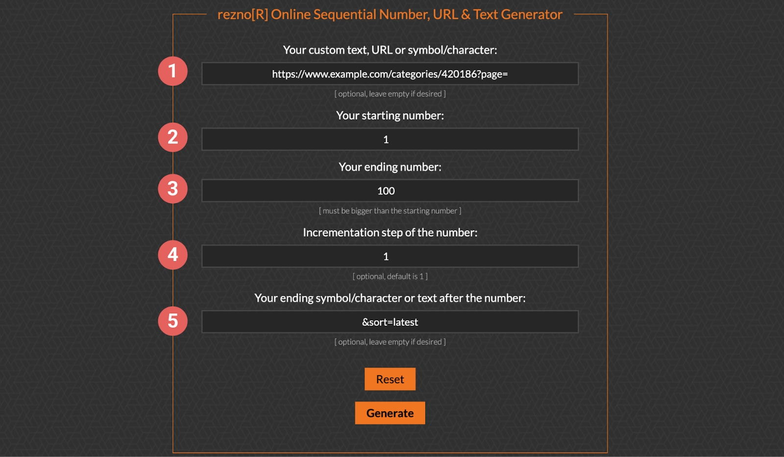 ➎ 페이지 숫자 뒤, 변하지 않는 부분을 입력합니다. 없다면 비워두셔도 됩니다. 입력을 마친 후, 하단의 [Generate] 버튼을 클릭하면 연속된 URL이 자동으로 생성됩니다.
