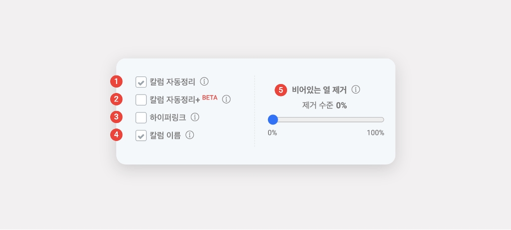 ➎ 비어있는 열 제거 : 빈칸 비율이 높은 열을 자동으로 제거합니다. 슬라이더로 기준을 조절(0~100%)해 제거 비율을 조정할 수 있습니다. 중요도와 관계없이 빈 칸 비율만을 기준으로 삭제되므로 주의가 필요합니다.