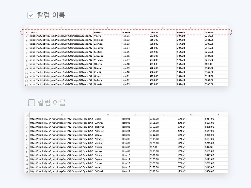 ➍ 칼럼 이름 : 엑셀의 각 열 첫 번째 행에 열 이름이 생성됩니다. 해제하면 열 이름 없이 데이터만 추출됩니다.