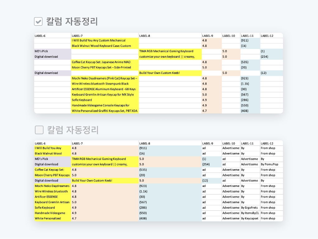 ➋ 칼럼 자동정리+ : 기존 자동정리보다 정렬 로직이 강화된 옵션입니다. 열의 흐트러짐이 많은 경우, 보다 안정적으로 데이터를 정리할 수 있습니다.