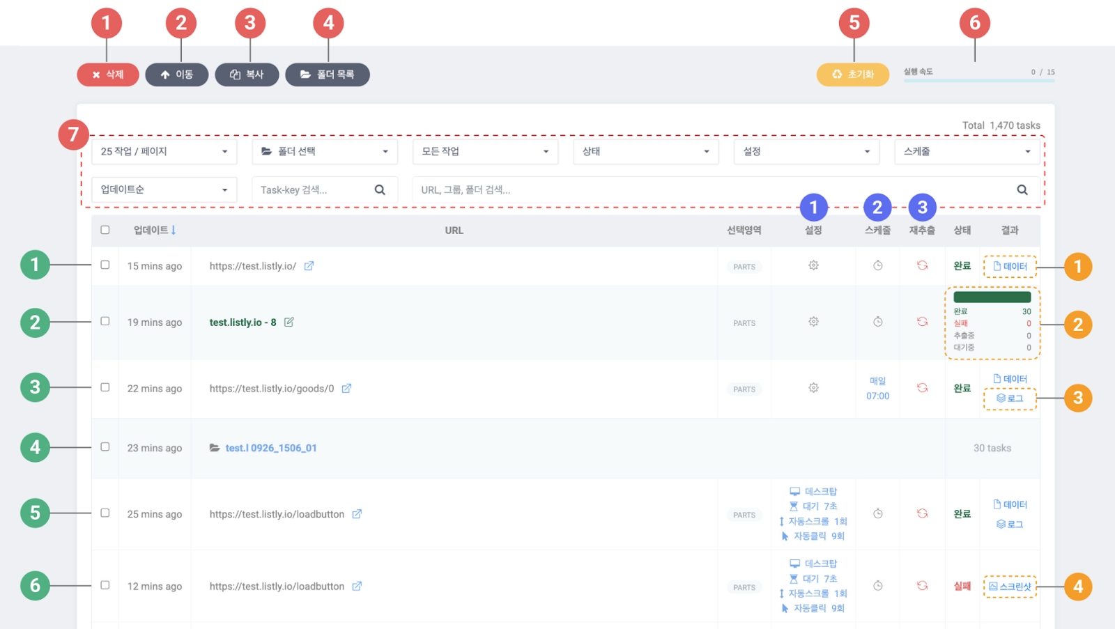 ➌ 복사 : 선택한 태스크를 복제합니다. 복제된 태스크는 원본의 설정값과 URL만 그대로 가져오며, 실행은 자동으로 시작되지 않습니다. 원본을 보존한 채 설정값을 수정·테스트할 때 유용합니다.