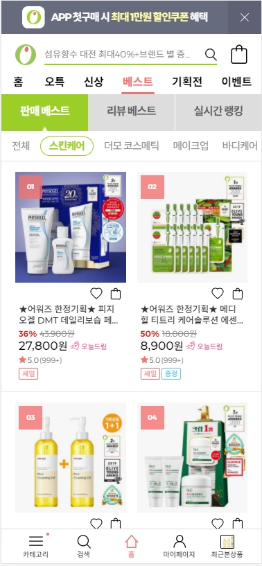 실제 국내 사용자의 사례입니다. 사용자는 오른쪽 그림과 같이 "스킨케어" 카테고리를 눌렀을 때 나타나는 내용들을 추출하고 싶은데, 해당 페이지 주소로 처음 접속하면 왼쪽 그림과 같이 "전체" 카테고리 상품들을 보여주는 것이 기본 값입니다.