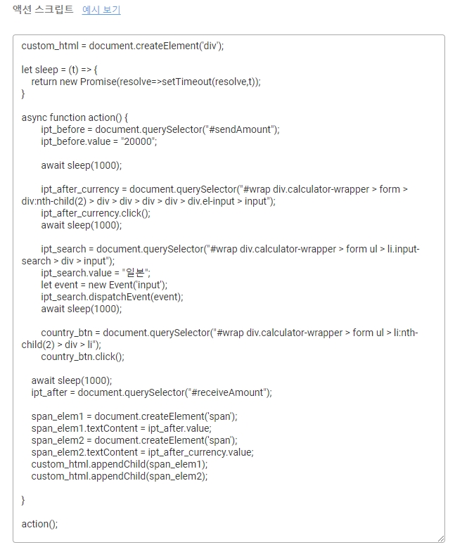 실제 국내 사용자 사례입니다. 실시간 환전 정보를 모니터링 하기 위해, 환전할 금액 입력 → 국가를 선택하여 최종 금액을 수집합니다. 여기에서 사용한 액션 스크립트는 조금 다릅니다. custom_html 이라는 변수를 사용하여, 추출하는 정보를 직접 선별해서 구성했고, 3번째 그림처럼 딱 원하는 정보만 추출되도록 설정했습니다.