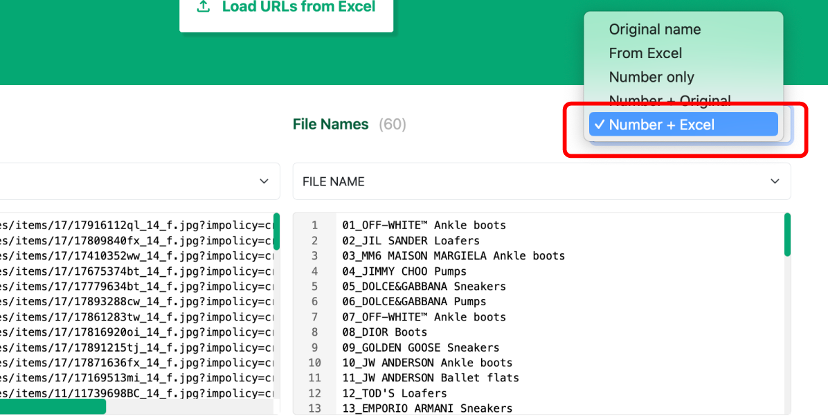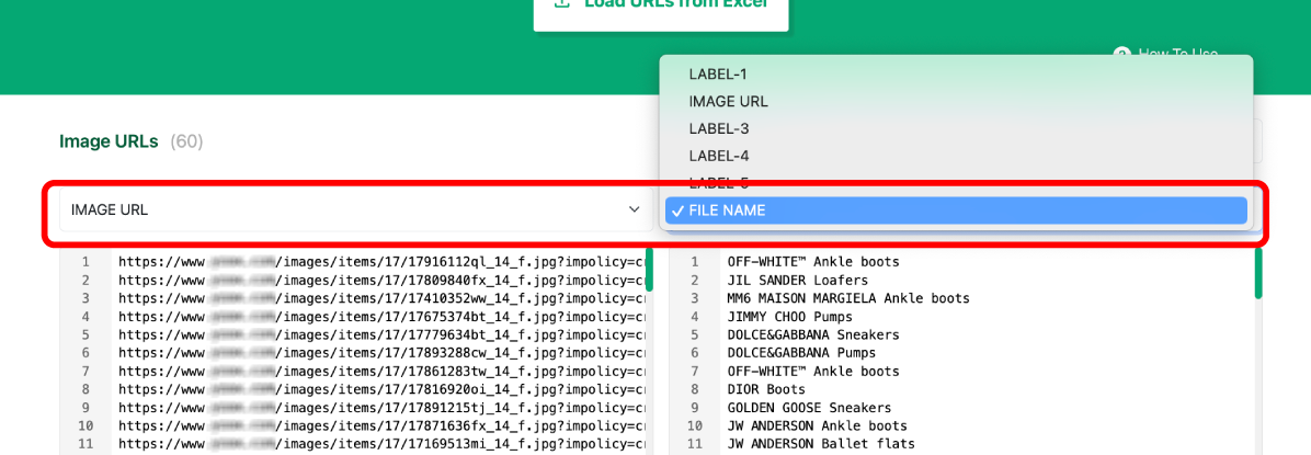파일을 업로드하지 않고, URL을 붙여넣을 수도 있지만, 각 이미지에 원하는 파일명을 부여하기 위해서 엑셀파일을 업로드 하는 것을 추천합니다.