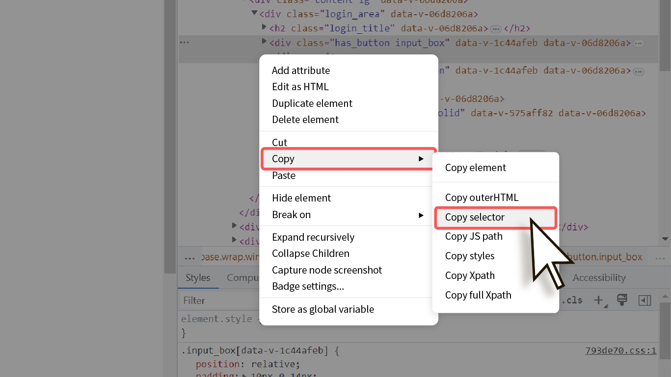 회색으로 강조 표시된 코드 위에서 마우스 오른쪽버튼을 클릭하여 Copy -> Copy selector를 선택하시면 자동으로 해당 selector의 값이 복사됩니다.