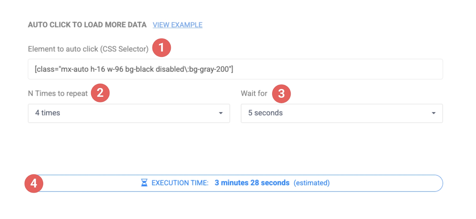 ➊ Element to Auto-Click (CSS Selector):输入 Load More 按钮的 CSS 选择器值。