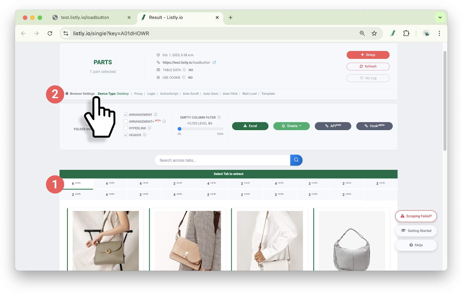 在结果窗口中,➊ 选择要提取的数据区域,然后 ➊ 点击浏览器设置区域。