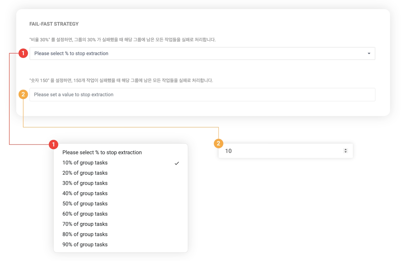 ➊ 百分比设置:当任务在所选百分比时失败,剩余任务将被标记为失败。