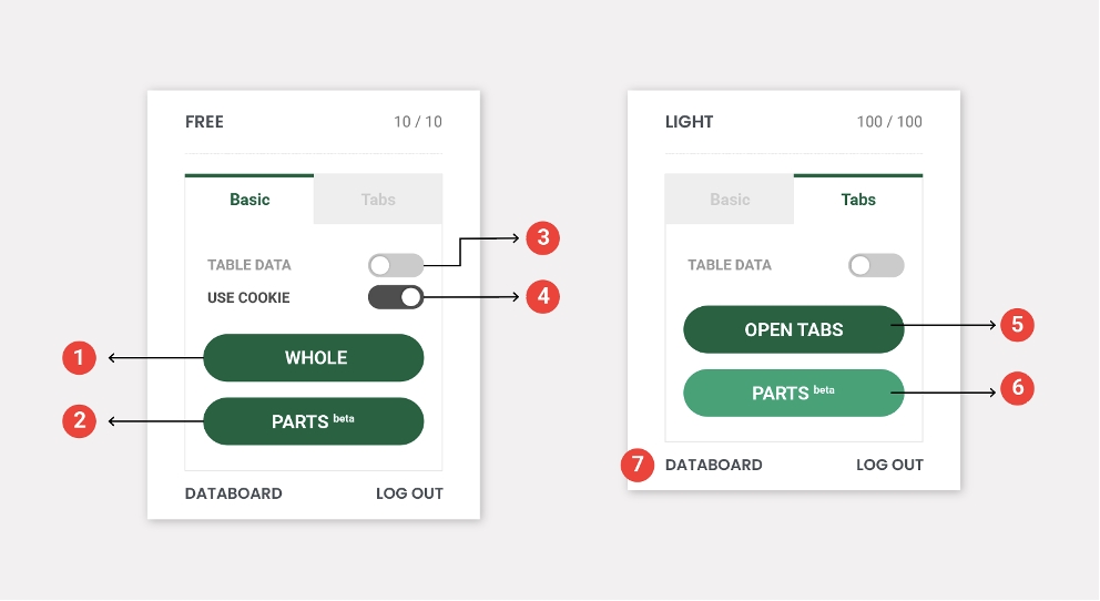 ➋ 部分+(PARTS):只选择想要的区域部分提取数据的功能。可以提高想提取数据的排列和提取准确度。点击后,会出现部分选择选项设置面板。 链接:https://help.listly.io/docs/ko/getting-started/listly-basics/parts-extraction