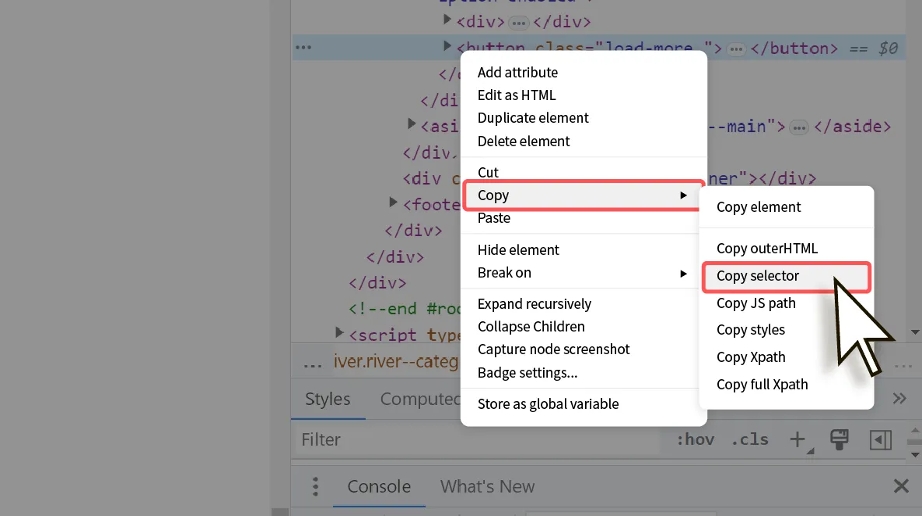 要使用自动点击、自动登录、分页模板等功能,需要指定要点击元素的 Selector 值。本说明将引导如何获取该 Selector 值。