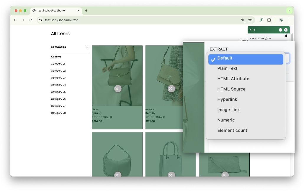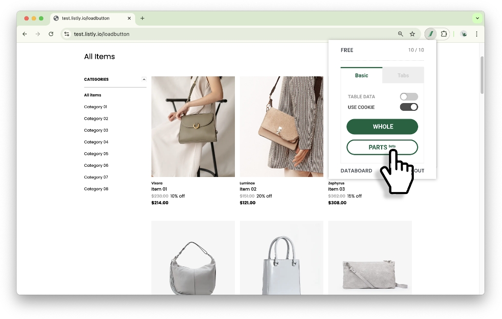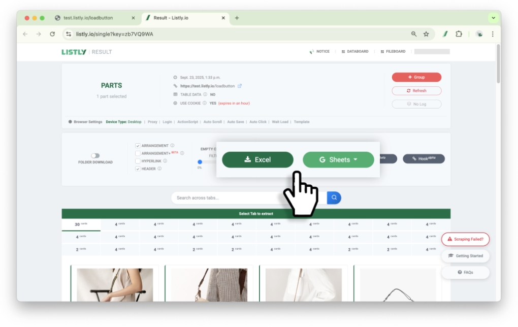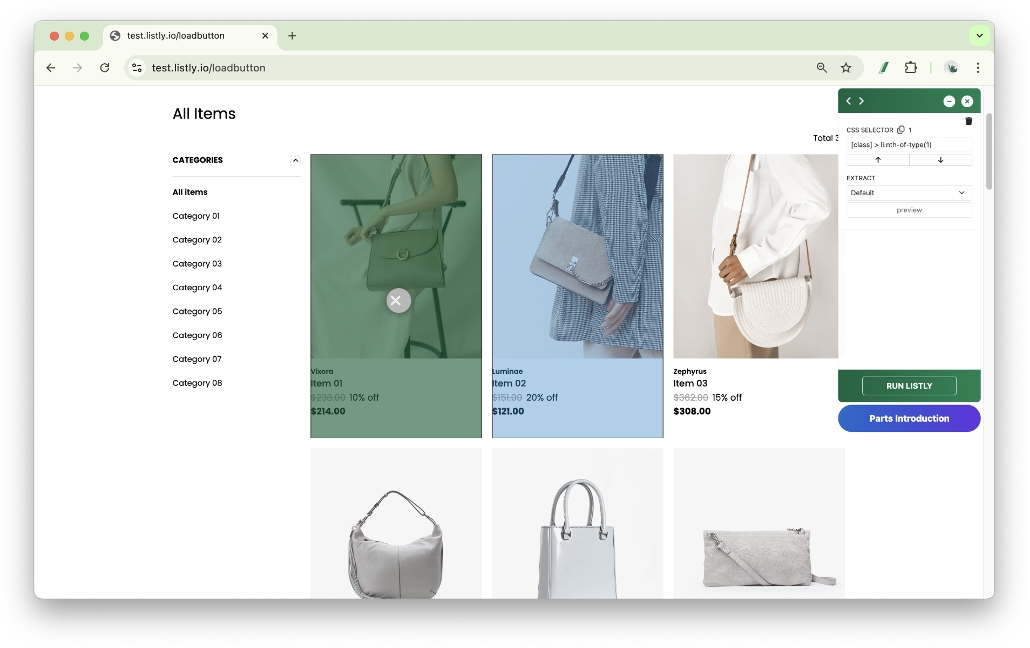 ➡️ 在想要的页面点击 Listly 图标 ➡️ 选择部分+(Parts)➡️ 选择想要的数据提取区域 ➡️ 在面板选择提取选项(选项)➡️ 点击 RUN LISTLY ➡️ 在结果窗口选择要提取的标签 ➡️ 下载 Excel 文件