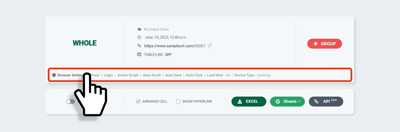 然后使用 [+Group] 按钮添加 URL,相同的 Action Script 行为将反映在所有批量页面上。