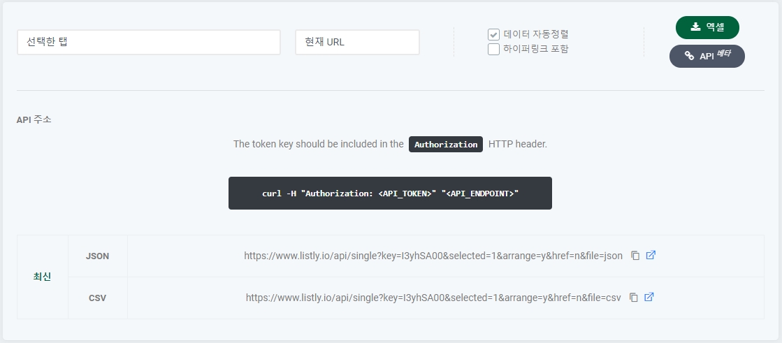 LISTLY API 可以被视为将提取的数据传送到您想要位置的数据管道。如下所示,每个数据结果页面都有一个 API 按钮,点击它会显示指向该结果的 API URL。访问该 URL 会显示与 Excel 中相同的数据。使用此功能,您可以与 Google Sheets 集成,或编写额外代码将数据放入您自己的数据库。