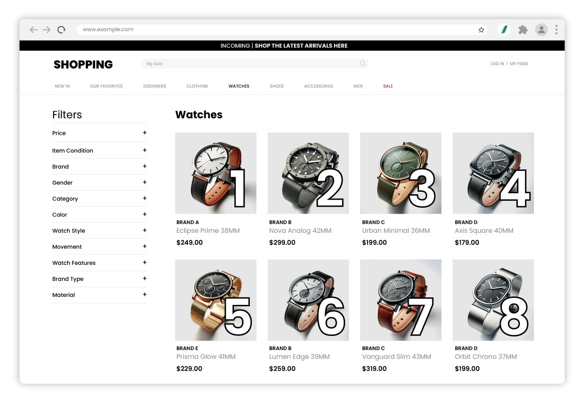 例如,假设产品图片在网站上按如上所示的顺序显示。