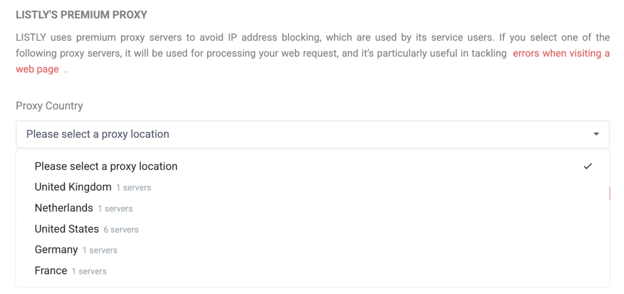在 [设置 → Listly 高级代理] 中尝试从另一个国家选择 IP。您可以通过更换 IP 地址重新访问被阻止的页面。请注意,此代理是所有 Listly 服务器用户使用的共享资源,因此可能会出现速度下降或临时连接不稳定的情况。