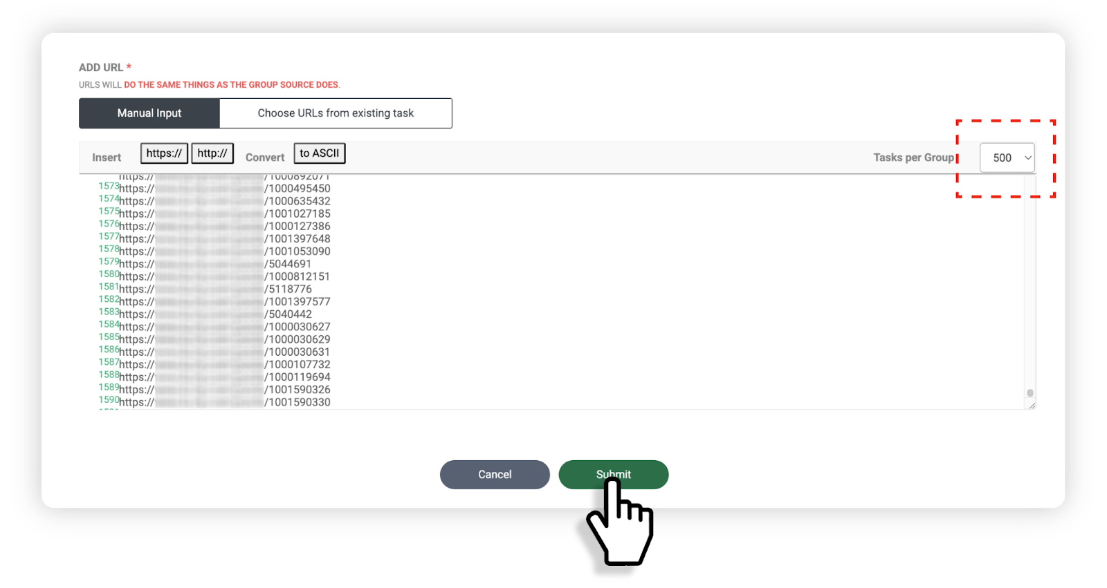 將要提取的 URL 列表貼上到群組 URL 輸入框中,然後在輸入框右上角的 Task per Group 選項中選擇每個群組要包含的 URL 數量。