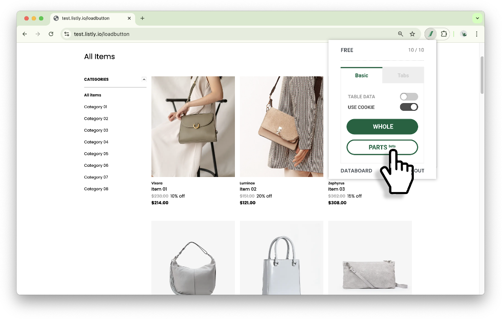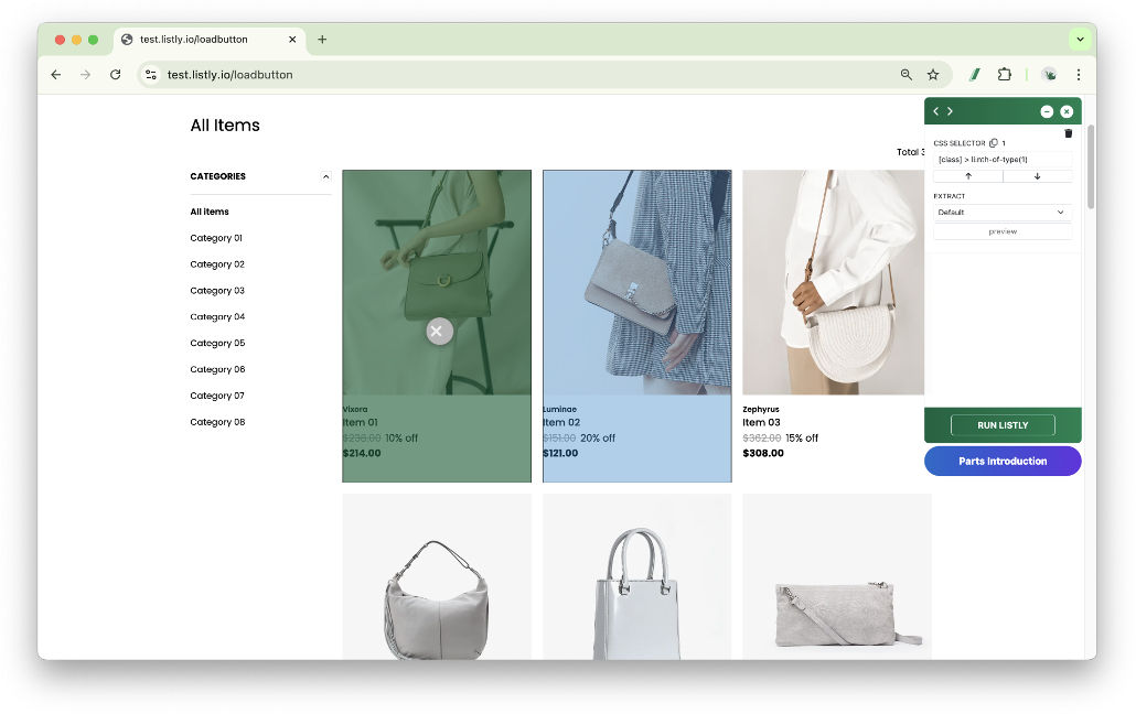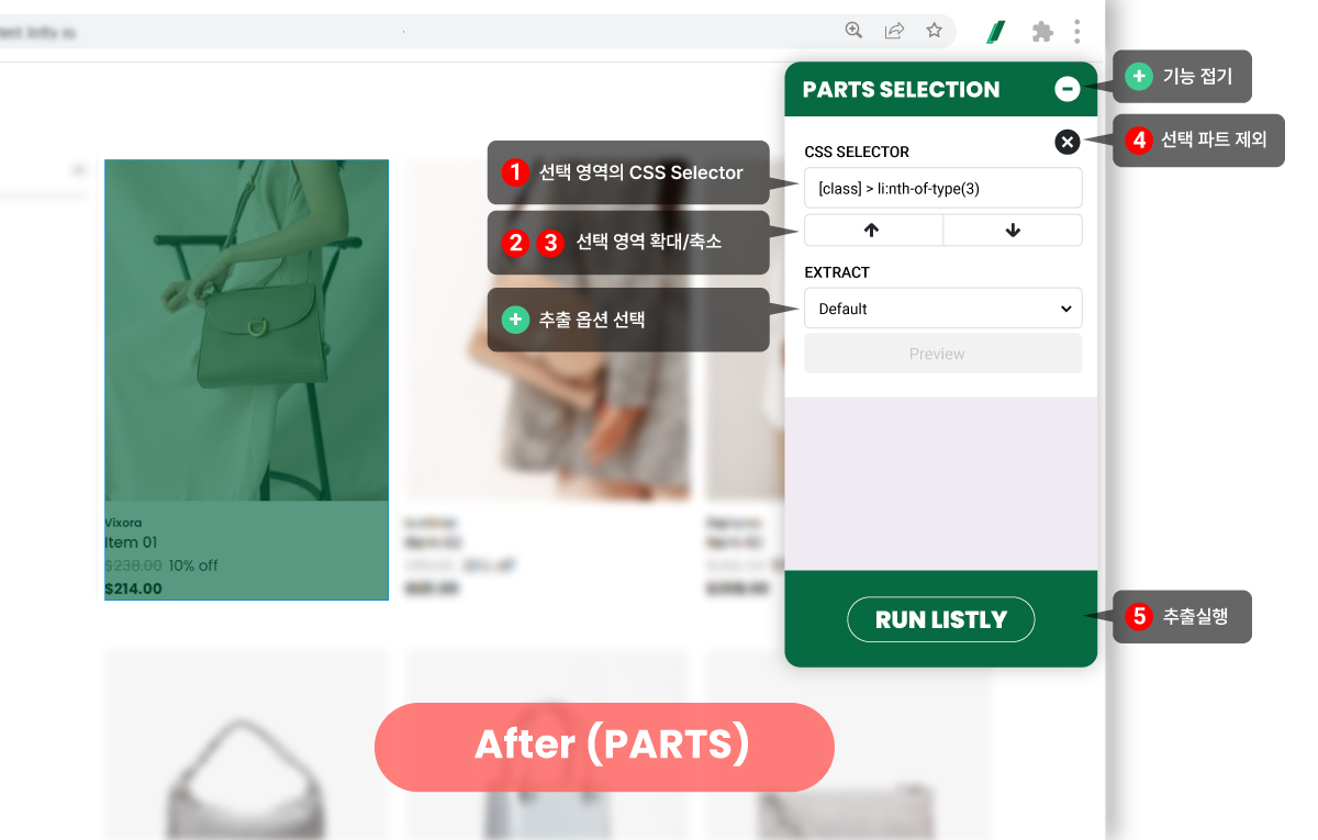 ➡️ 在目標頁面點擊 Listly 圖示 ➡️ 選擇 PARTS ➡️ 選取想要的資料擷取區域 ➡️ 在面板中選擇擷取選項(選用) ➡️ 點擊執行 LISTLY ➡️ 在結果視窗中選擇要擷取的分頁 ➡️ 下載 Excel 檔案