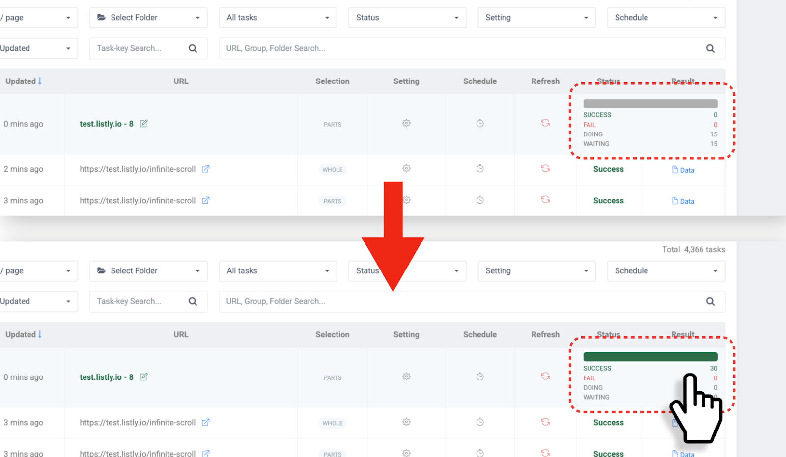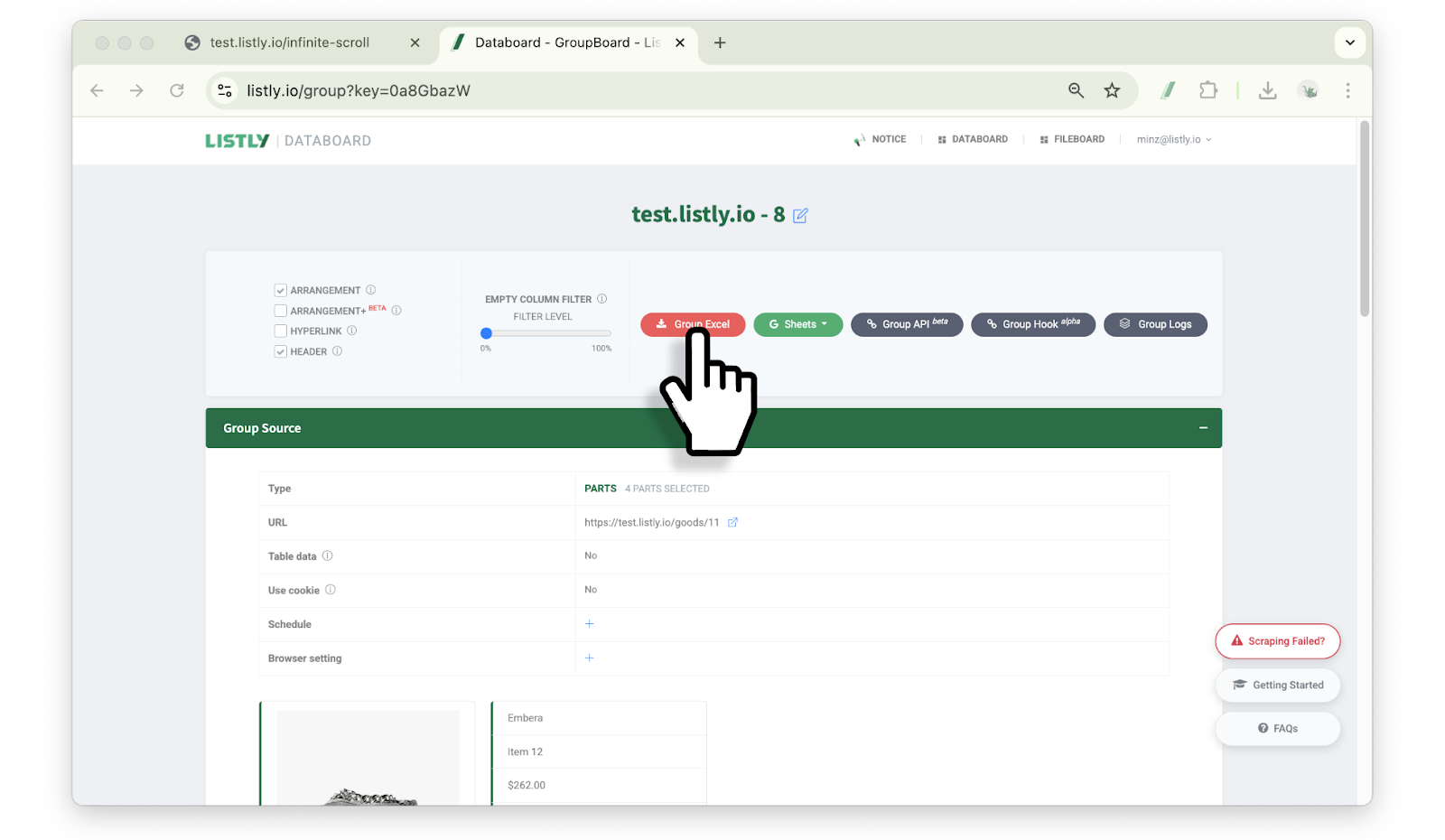 先提取一個代表頁面後,在結果視窗按**【+群組】**按鈕新增相關頁面的 URL,剩下的頁面 Listly 會自動提取。