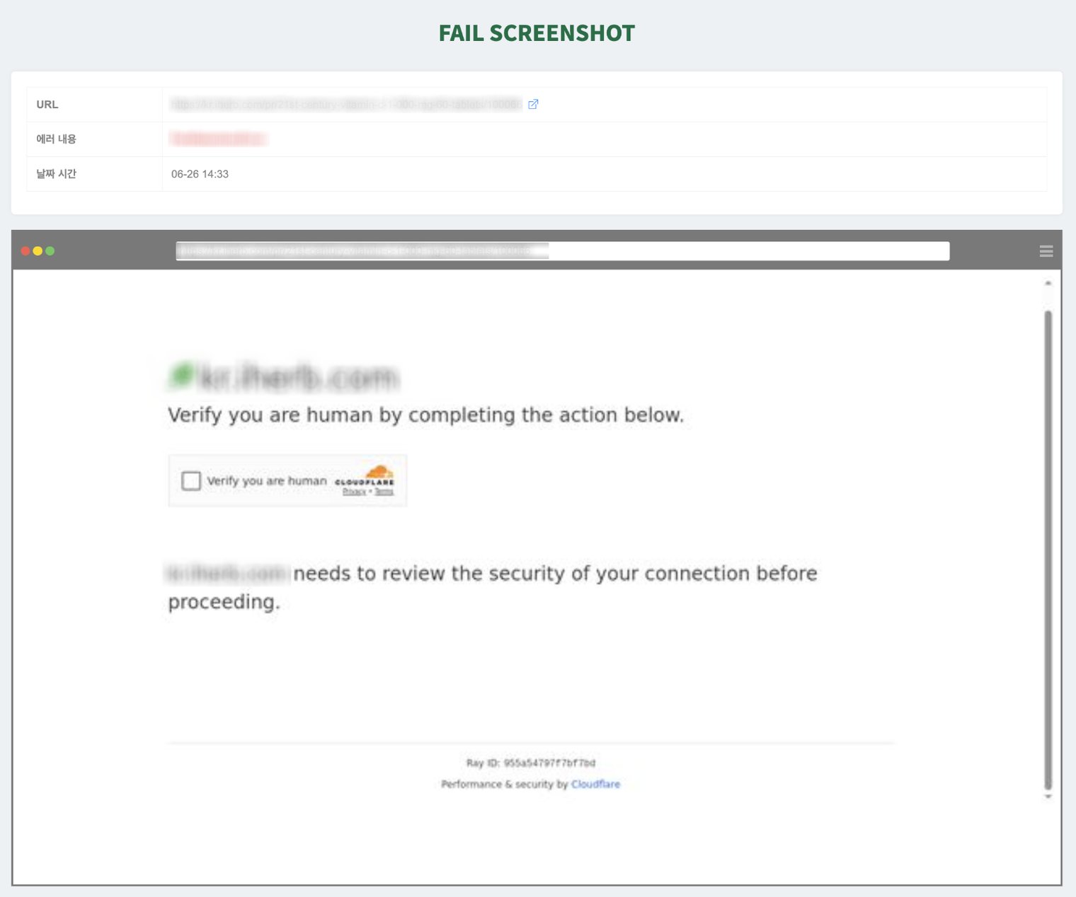 在截圖中顯示 CAPTCHA、機器人偵測、權限檢查或其他表示封鎖的訊息,且即使稍後重試後仍重複出現相同畫面,收集器正被目標網站封鎖。無論錯誤代碼為何,在這種情況下需要代理設定。