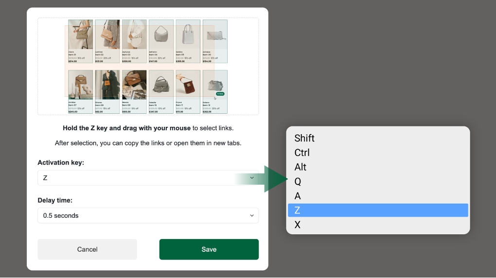Activation key: The [Open Multiple Tabs] feature is activated while holding down the configured shortcut key.