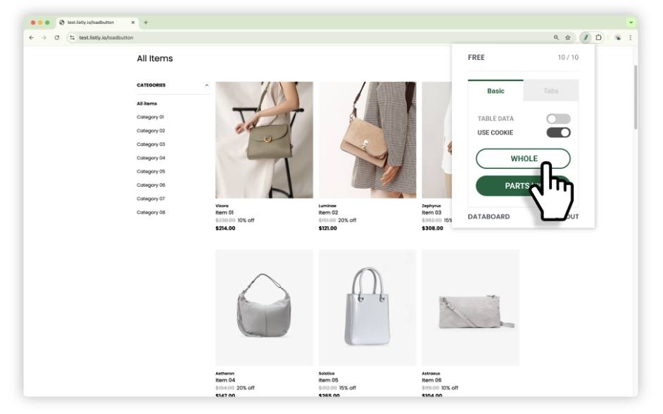It's a feature that allows you to extract all the information visible on the screen with one click. Listly automatically analyzes the web page and recommends the optimal data pattern. Use whole extraction when you want to extract data simply and quickly.