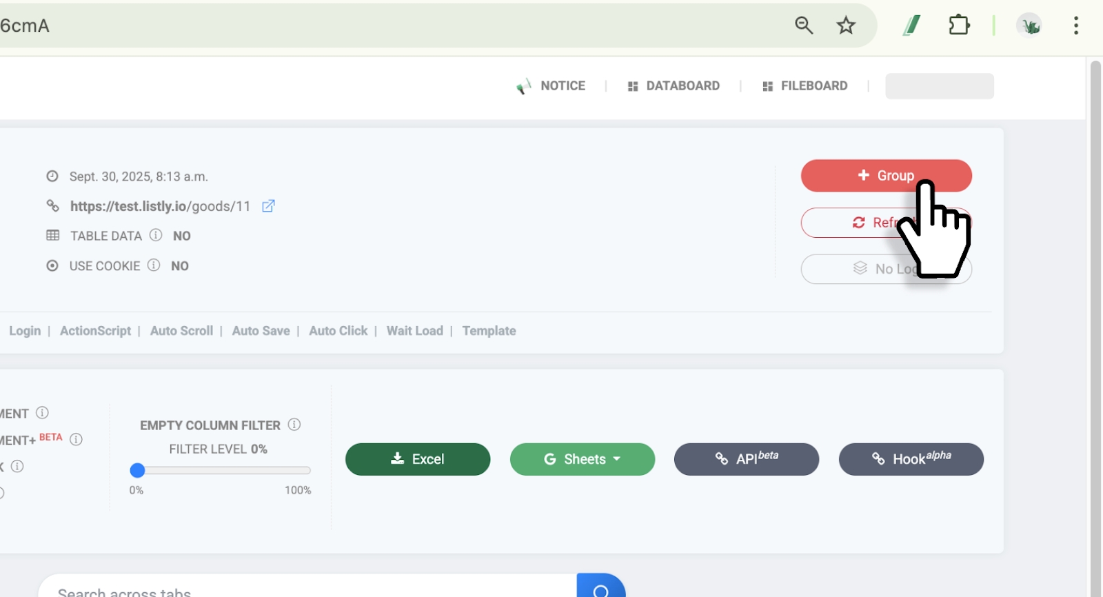 After extracting one representative page first, click the [+Group] button in the result window and add URLs of related pages—Listly will automatically extract the rest.