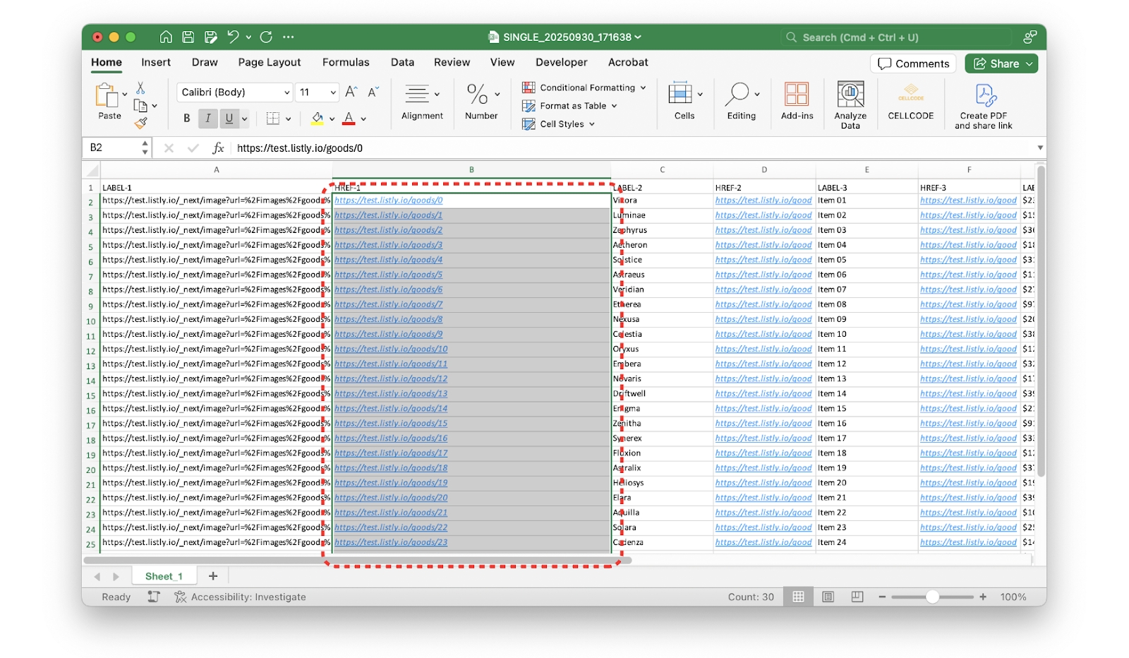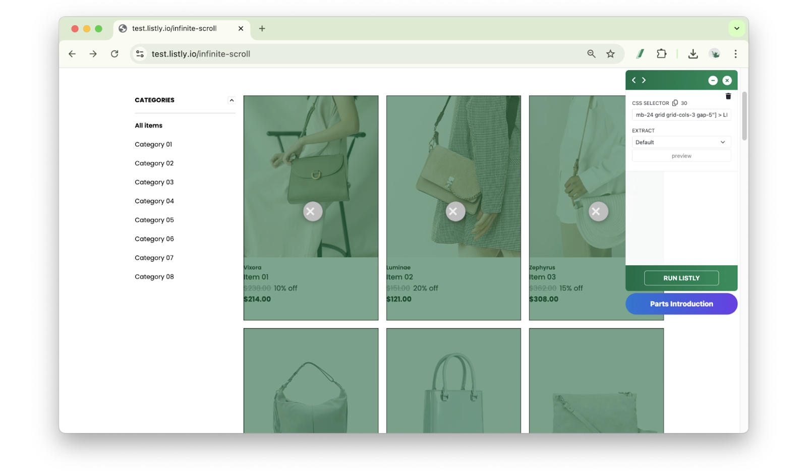 Before accessing detail pages, extract page information from the list page where those pages are gathered using Listly. You can use either [Whole] or [Parts] extraction, but it's important to select an area containing 'links to detail pages'.