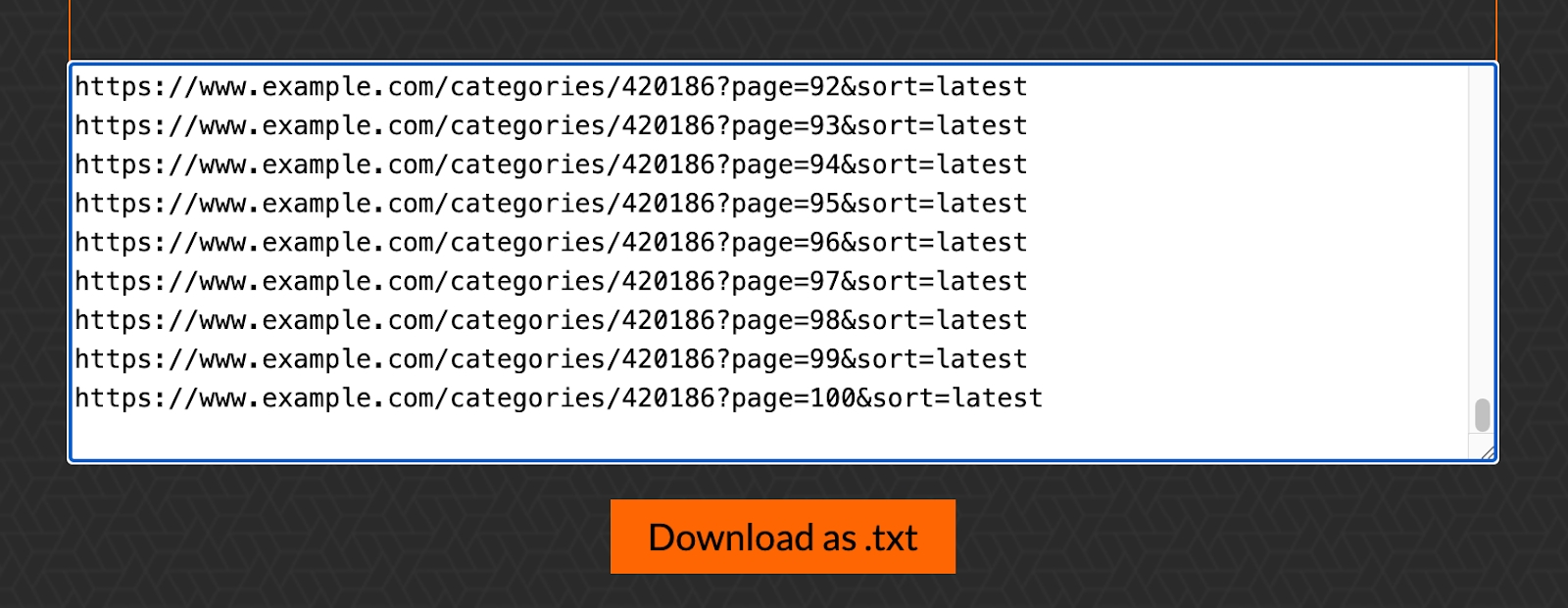 You can easily generate sequential page addresses using LLM-based conversational AI services like ChatGPT. After checking the page URL pattern like the example page below, try saying "Create URL addresses with Page number from 1 to 30".