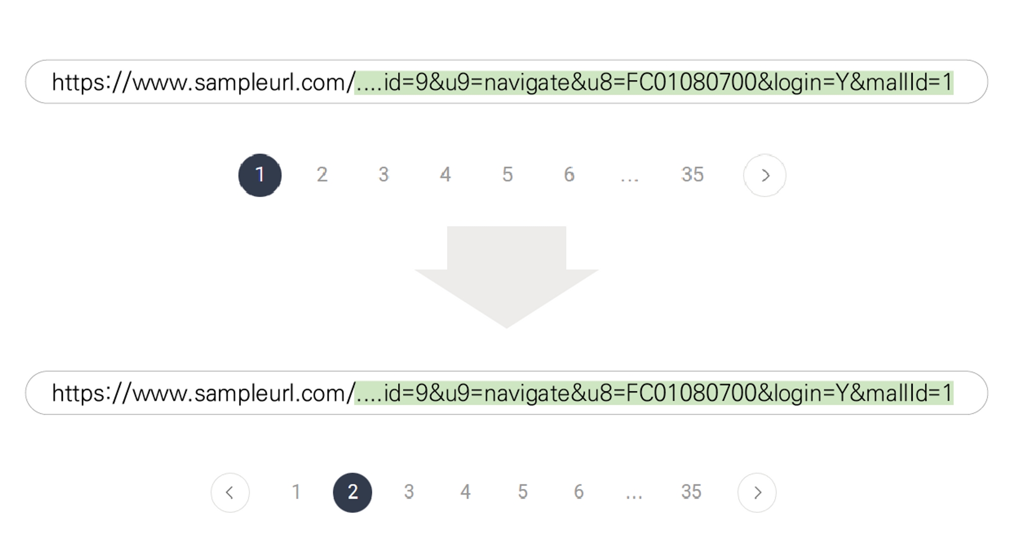 하지만 아래 이미지처럼 1 페이지에서 2 페이지로 이동해도 URL 주소가 변하지 않는다면, 액션스크립트를 이용해 데이터를 추출하고자 하는 개별 페이지의 URL 추출 후, 필요한 데이터를 수집하실 수 있습니다.