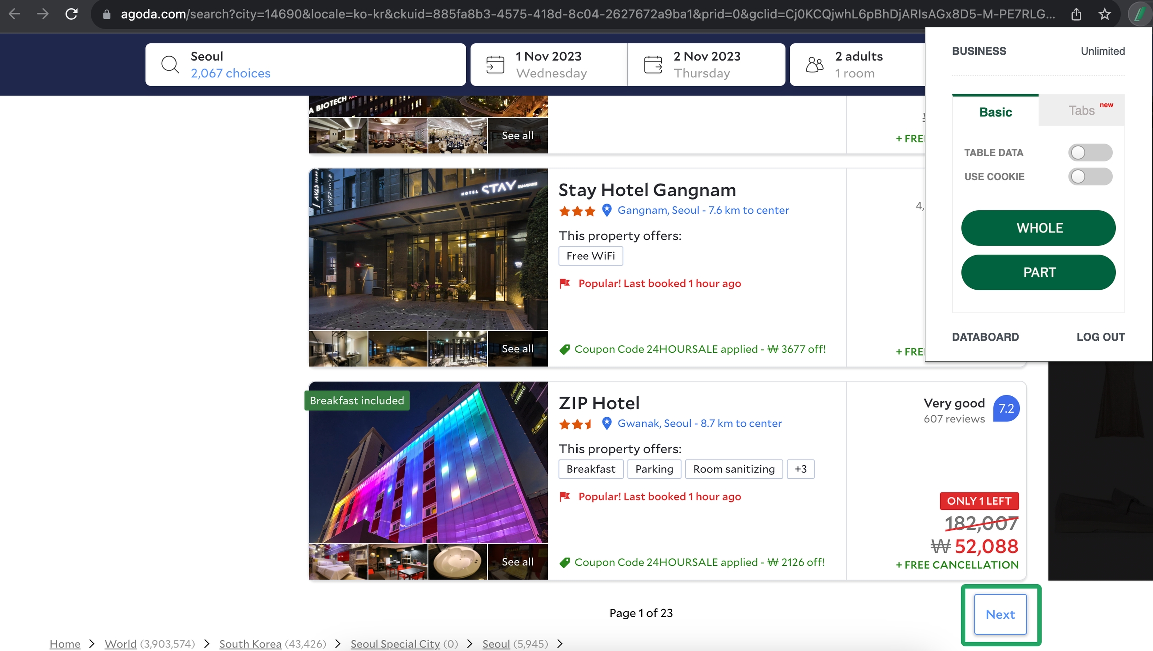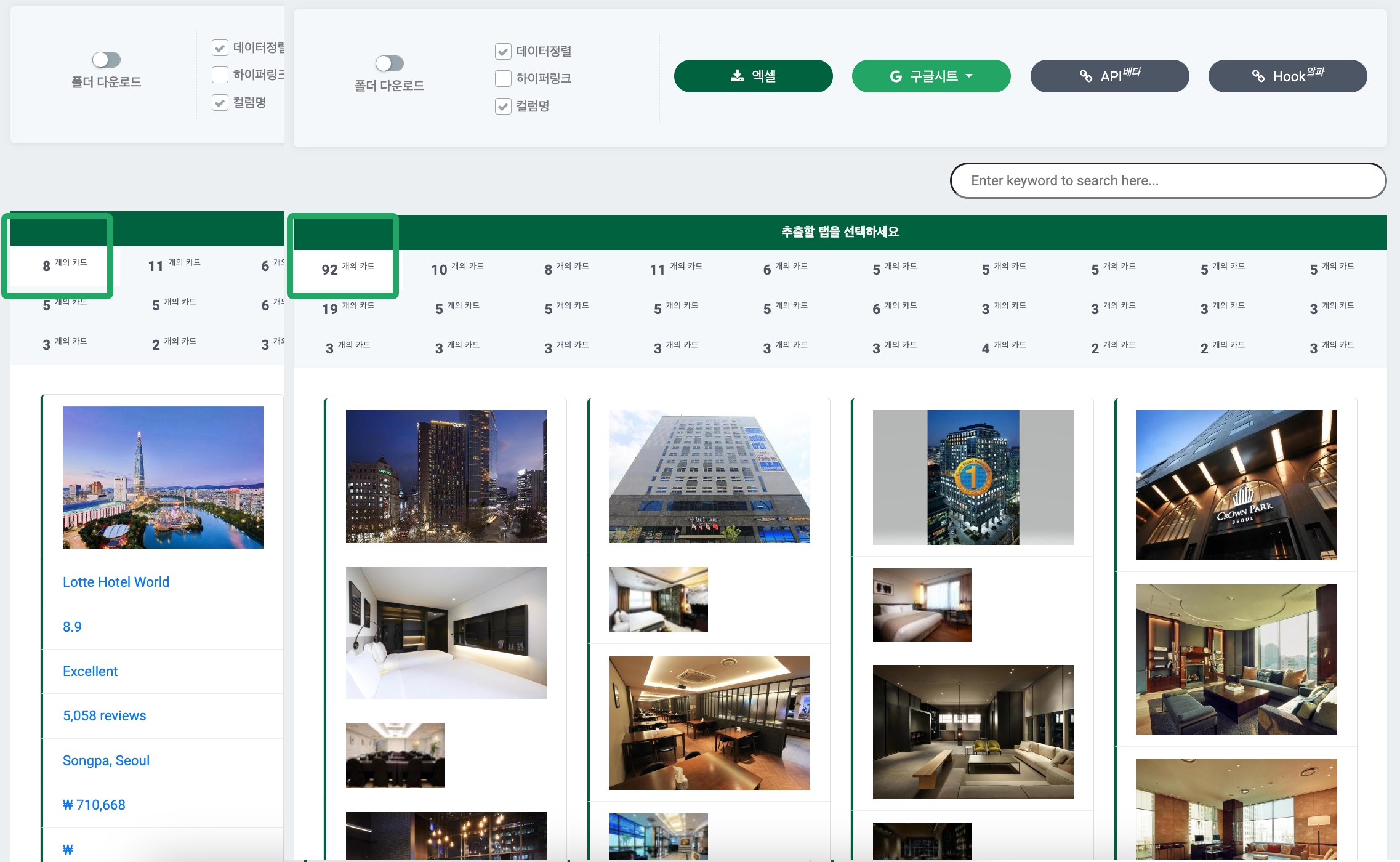네, 가능합니다. 한 페이지 내에서 스크롤 다운을 한 후, 여러 페이지네이션 페이지에 나누어 저장되어 있는 데이터를 추출하실 수 있습니다. 이 경우, 설정 페이지에서 자동 스크롤 기능을 설정해주고 그룹 추출로 여러 페이지 데이터를 한 번에 모아 추출하시는 형태라고 볼 수 있어요. 다만, 추출 실행 시간이 10분을 넘어가지 않도록 자동 스크롤 설정값을 조정하셔야 추출 실패 없이 모든 데이터를 추출하실 수 있습니다. 한 가지 예로, 특정 호텔 예약 웹 사이트에 접속해 리스틀리 확장프로그램을 클릭하면 8개의 호텔 정보만 수집됩니다. 해당 웹 페이지에서 데이터가 로딩되는 데에 시간이 걸리기도 하고, 페이지 하단까지 스크롤 다운을 해야 모든 데이터가 나타나는 구조이기 때문인데요. 자동 스크롤 기능을 5회 정도로 설정해주었더니, 해당 페이지에 있는 92개의 호텔 목록 정보가 모두 수집되었습니다.