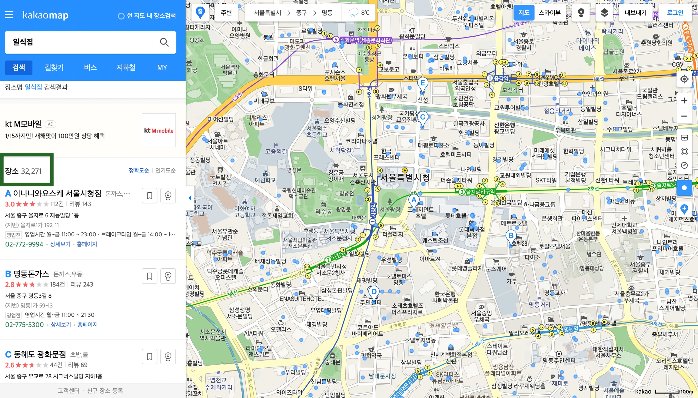예를 들어, 네이버 지도나 카카오맵과 같은 지도 서비스에서 '일식집' 검색 시 나타나는 검색 결과를 추출한다고 가정해 보겠습니다. 해당 키워드 검색 시 검색 결과가 8,000개가 넘고, 페이지 수는 30페이지가 넘는데요. 아무리 줌 아웃을 해보아도 한 번에 8,000개의 데이터가 한 페이지에 모두 나오지 않아 데이터를 전부 추출하기가 쉽지 않습니다. 왜 이런 현상이 발생하는 걸까요? 이유는 간단합니다. 해당 지도 서비스들이 의도적으로 모든 검색결과를 공개하고 있지 않기 때문입니다. 실제 식당 리스트를 확인하고자 지도 서비스를 사용하는 사용자의 경우, '송파 일식집' 을 검색 시 1 페이지이든, 2 페이지의 검색 값에서 원하는 결과가 나오면 서비스를 이용하는 데에 큰 문제가 없죠. 30 페이지까지 정보를 찾아가면서 검색 결과를 확인할 필요가 없습니다. 그렇기 때문에 지도 서비스를 제공하는 기업의 입장에서 30 페이지에 나온 결과 값까지 방대한 양의 데이터를 뽑고자 하는 사용자라면 제 사용자보다는 해당 서비스의 데이터베이스를 활용할 잠재적 경쟁자라고 판단할 수밖에 없습니다. 따라서 지도 서비스에서 검색결과와 지도상에 나타나는 정보를 외부에서 추출하기 쉽게 한 번에 보여주지는 않을 것으로 보여집니다.