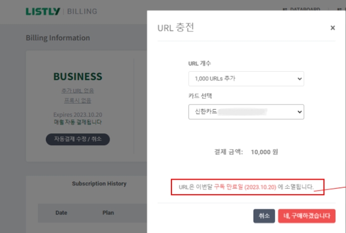 하나의 웹 페이지 URL을 추출할 수 있는 단위를 리스틀리 크레딧 (credit)이라고 합니다. 크레딧은 필요 시 추가로 충전해 사용하실 수 있어요. 다만, 리스틀리는 월 단위로 구독 플랜 서비스를 제공하고 있기 때문에, 연간 플랜을 결제하셨더라도 사용자 별로 한 달에 한 번 플랜 갱신일에 맞추어 크레딧 만료일이 지정되어 있습니다. 즉, 한 달에 한 번씩 데이터를 추출할 수 있는 크레딧이 리셋되는 크레딧 만료일이 존재합니다.