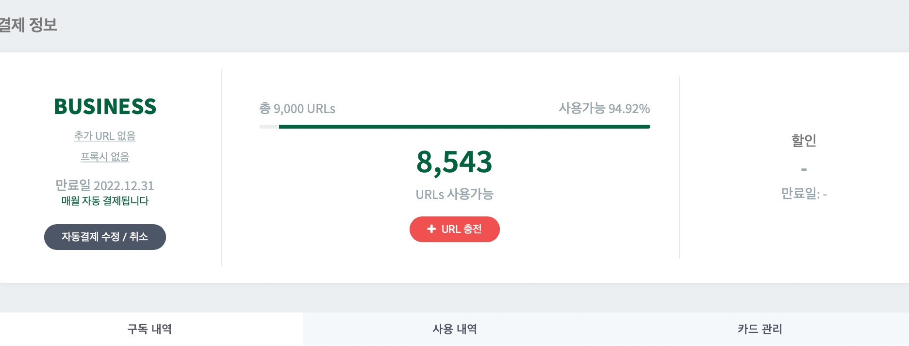 * 비즈니스 플랜(Business Plan) : 1,000 URL 당 10,000원* 라이트 플랜(Light Plan) : 100 URL당 10,000원 * 추가로 충전한 크레딧은 월간 갱신 주기에 따라 해당월 구독 만료일에 소멸됩니다.